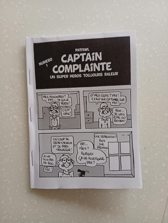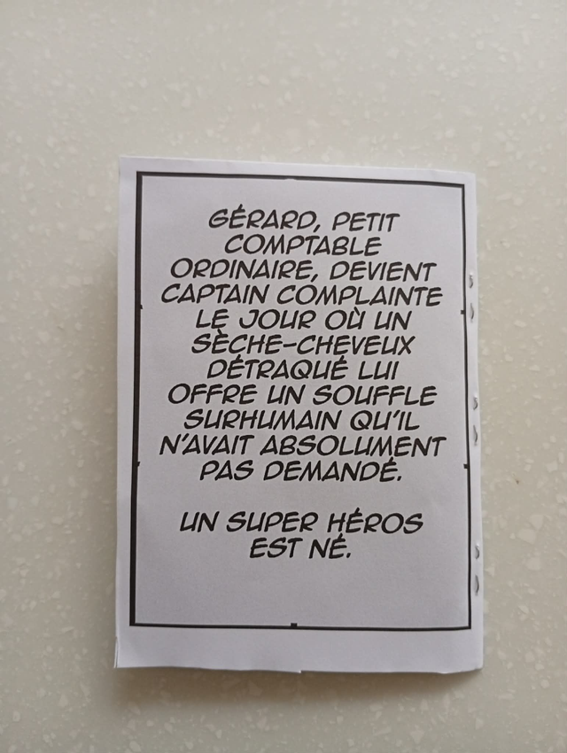 Gérard, petit comptable sans histoire qui pense qu'a se plaindre, voit sa vie basculer le jour où un sèche‑cheveux défectueux le transforme en surhumain au souffle dévastateur. Propulsé malgré lui au rang de “héros”, il préférerait largement retourner à ses tableaux Excel et se plaindre de sa petite vie. Voici la naissance de Captain Complainte, le super‑héros qui soupire plus fort qu’il ne frappe. ("MiniComix" de 8 pages, 2 euros.) D'autres numéros arriverons !