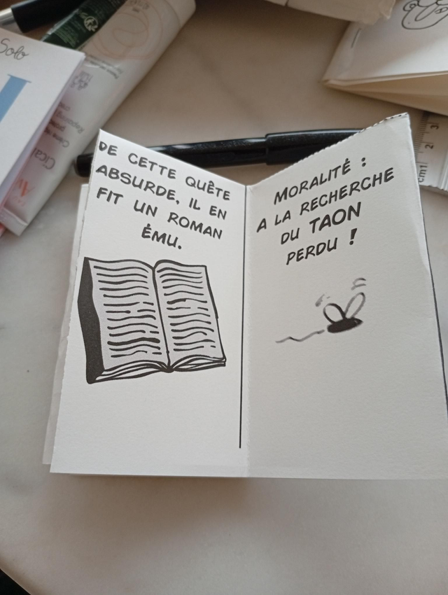 Un Zine express est un mini‑zine artisanal, écrit et dessiné en forme courte, qui raconte une micro‑histoire poétique et humoristique en six pages. C’est une fable de poche, fulgurante et illustrée, pensée pour être lue, offerte et collectionnée. Voici donc le premier zine express, inventé par Peter Patfawl pour sa nouvelle collection "Foutoir de poche".